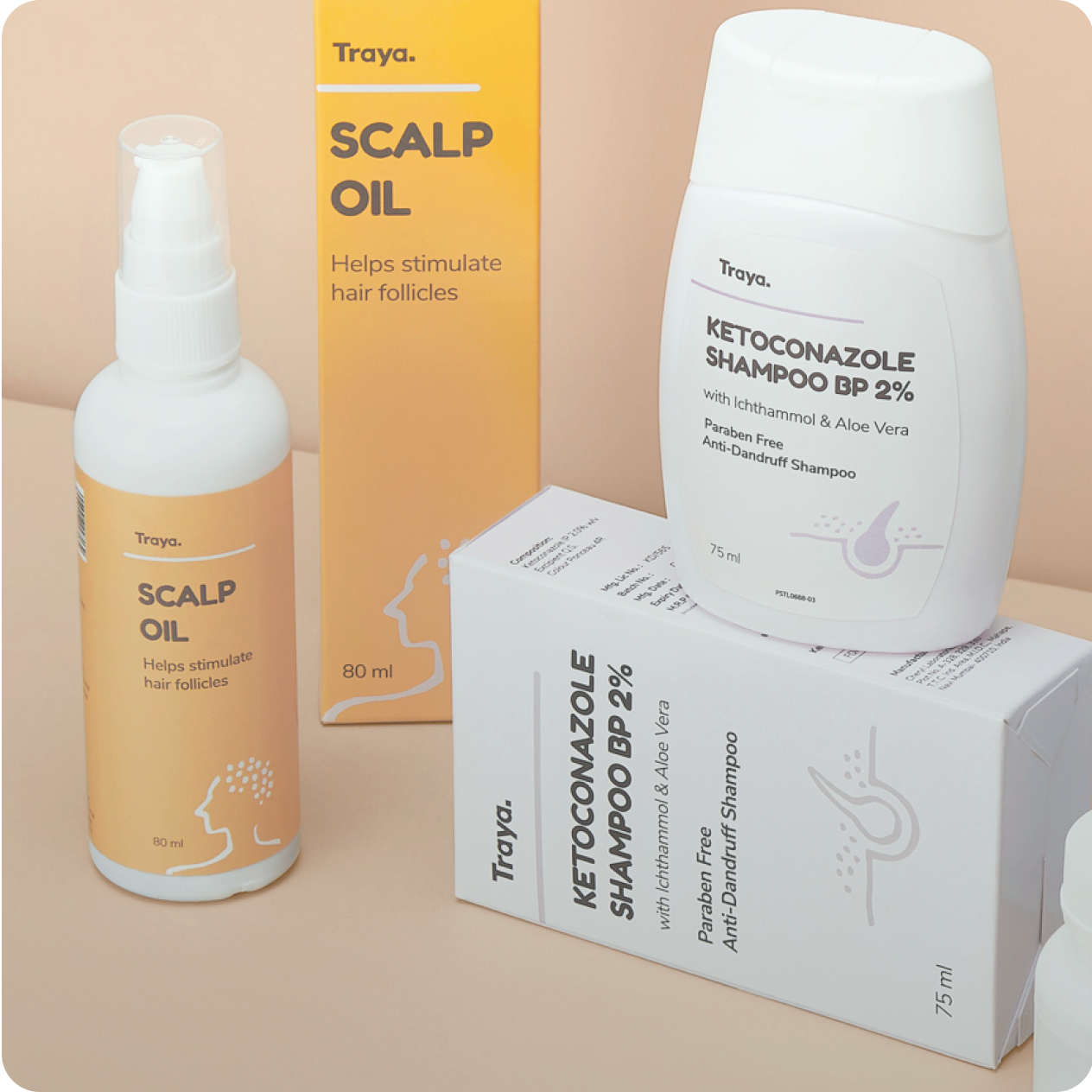 Traya’s 3 Science Formula is a synergistic mix of Ayurveda, Allopathy & Food Science designed specifically to cater to hair loss conditions stemming from multiple root causes. With clinically tested ingredients and adaptogenic herbs, Traya’s Science-Backed formula clears internal blockages and boosts hair regeneration naturally. When blended with a healing dietary plan, it delivers great results in attaining long-term hair growth.