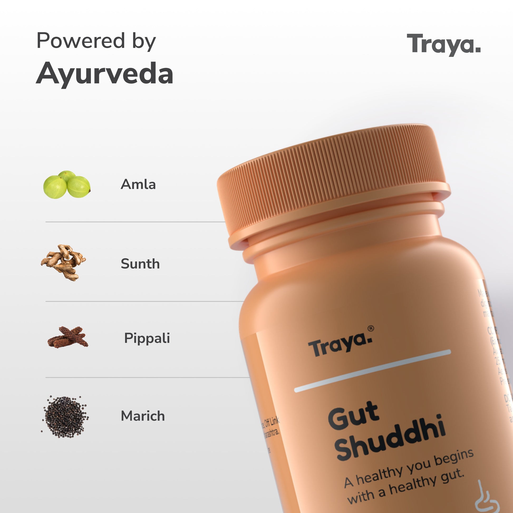 All-natural Ayurvedic gut health supplements that cleanse and detox the entire body. These digestive herbs help boost metabolism, cellular digestion, energy levels and absorption. Traya's digestive supplements target the root cause of poor gut health such as sluggish liver activity, low gut motility and poor nutrient absorption and promotes healthy digestion. Suitable for those with constipation, bloating, gas and acidity. Made with ayurvedic herbs that promote gut health and prescribed by an ayurvedic doctor.