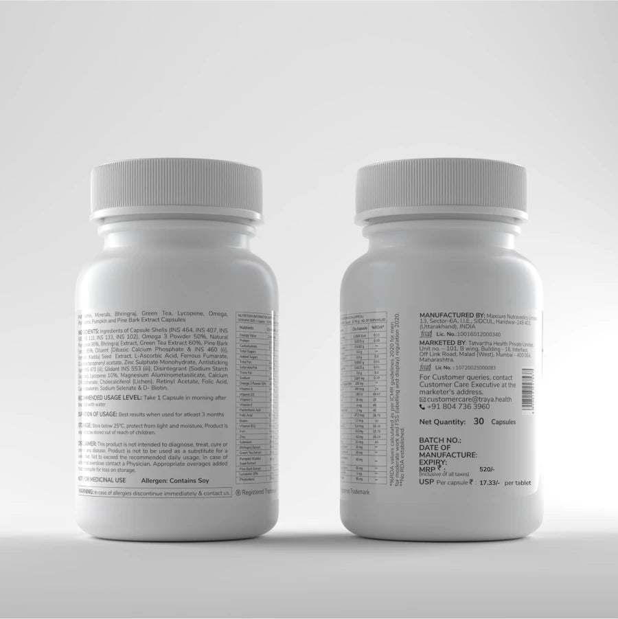 Traya hair vitamins contain zinc which helps in tissue growth and repair. Zinc in this multivitamin for hair also makes the oil glands around the follicles work properly.